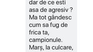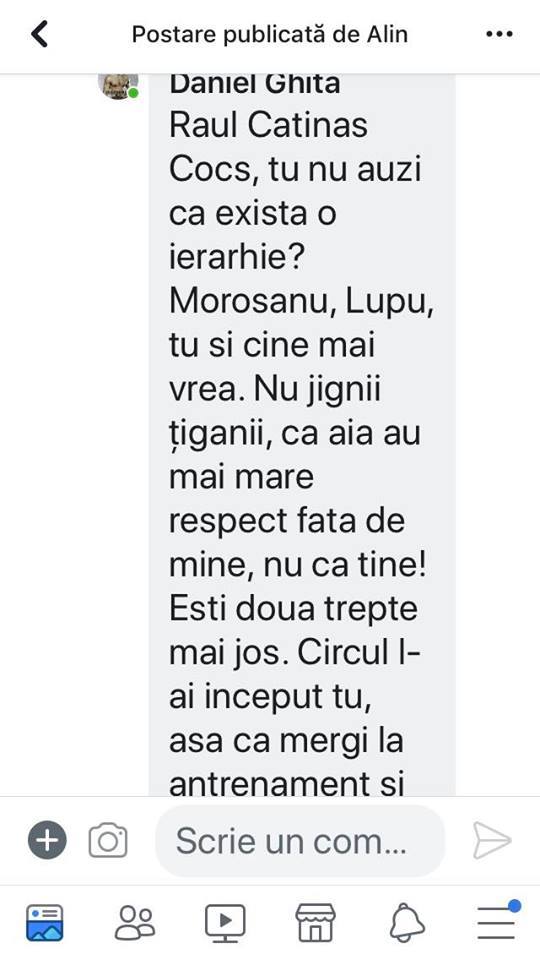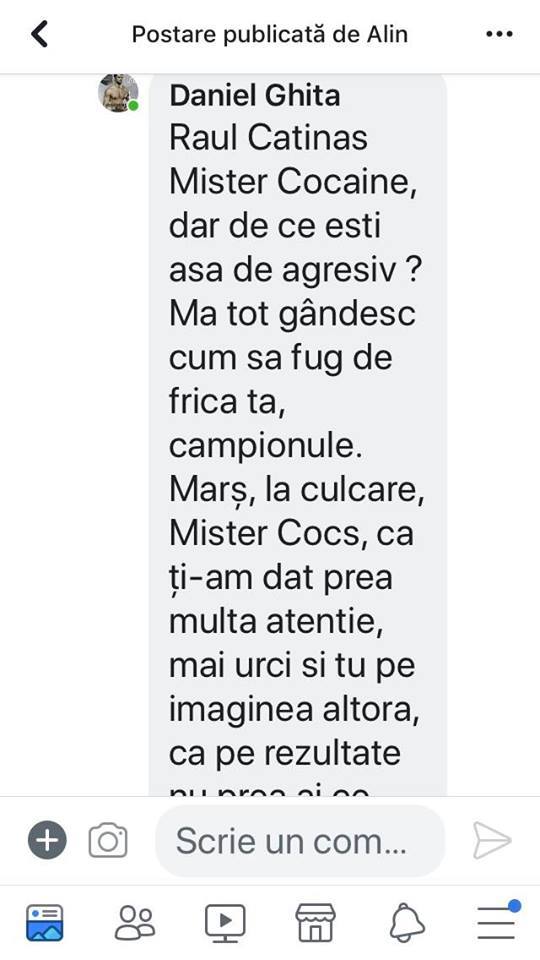 “Mister Cocaine de ce esti asa de agresiv? Ma tot gandesc cum sa fug de frica ta, campionule, mars la culcare Mister Cocs, ca ti-am dat prea mare atentie. Nu ai auzit ca exista o ierarhie? Morosanu, Lupu, tu si cine mai vrea sa lupte”, a replicat Ghita.