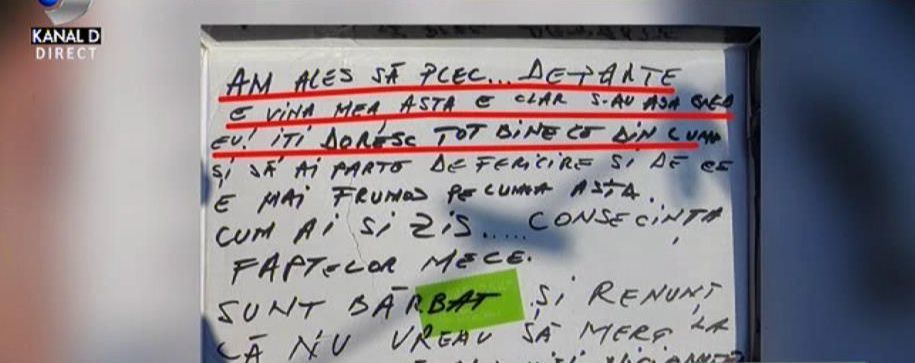 "Am ales sa plec departe. E vina mea, asta e clar. Iti doresc tot binele din lume si sa ai parte de fericire si de ce e mai frumos pe lumea asta. Cum ai zis...consecinta faptelor mele. Sunt barbat si renunt ca nu vreau sa merg la puscarie. Sa nu uiti niciodata ca te-am iubit foarte mult si pentru ca te iubesc foarte mult o sa ies din viata ta"