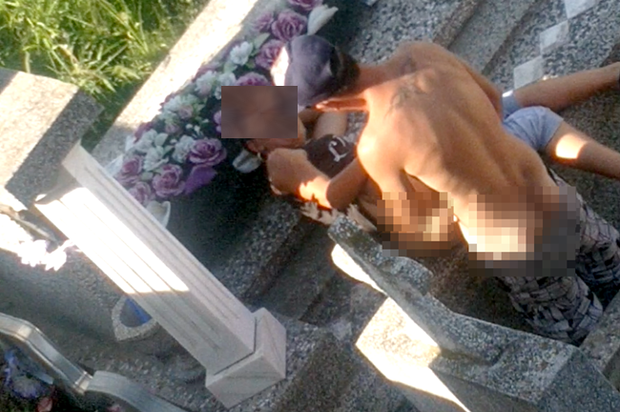 Imaginile au fost surprinse in in cimitirul de pe strada Fagetului din Lugoj. Fara pic de rusine, cei doi „amorezati” s-au dezbracat si au facut sex chiar pe unul dintre morminte. Scenele au fost surprinse de un cititor tion.ro, care a trimis cateva imagini pe adresa redactiei. Acesta sustine ca, de frica, nu a sunat la Politie, insa spera ca oamenii legii sa se sesizeze si sa ii pedepseasca pe cei doi, potrivit stirilekanald.ro.