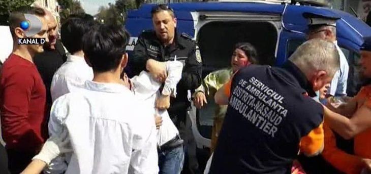 In toata nebunia cu arme albe apar si doi politisti locali, care vor sa-i opreasca pe agresori. Unul dintre agenti il prinde de brat pe un individ, dar ceilalti barbati inarmati sar pe politist. Se lasa cu imbranceli si tipete, iar angajatul scapa ca prin minune din mainile celor inarmati cu o secure. In scurt timp apar si intaririle, dar scandalul e departe de a se fi incheiat.
