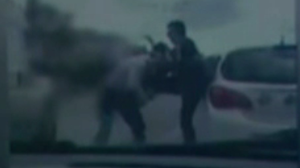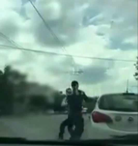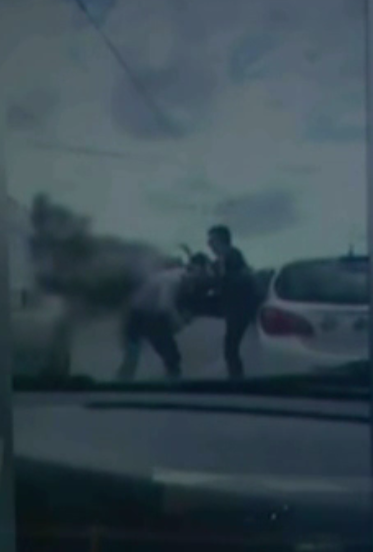 În imagini se observă cum bărbatul în negru sare să-şi lovească adversarul. Începe o încăierare ca-n filme, chiar pe mijlocul şoselei, în timp ce alţi participanţi la trafic se uită şi ţipă la cei doi scandalagii.