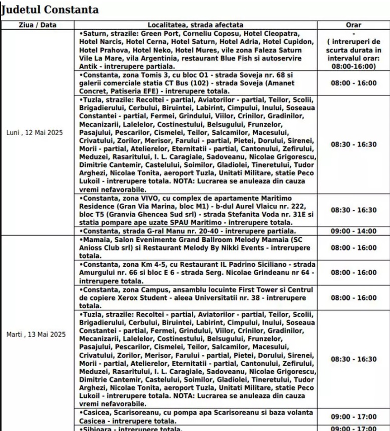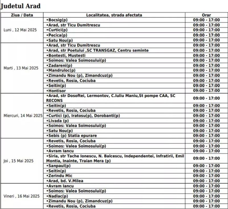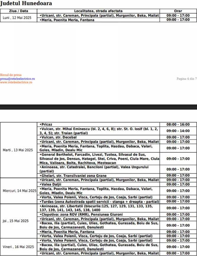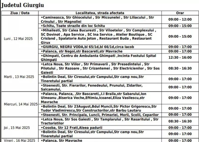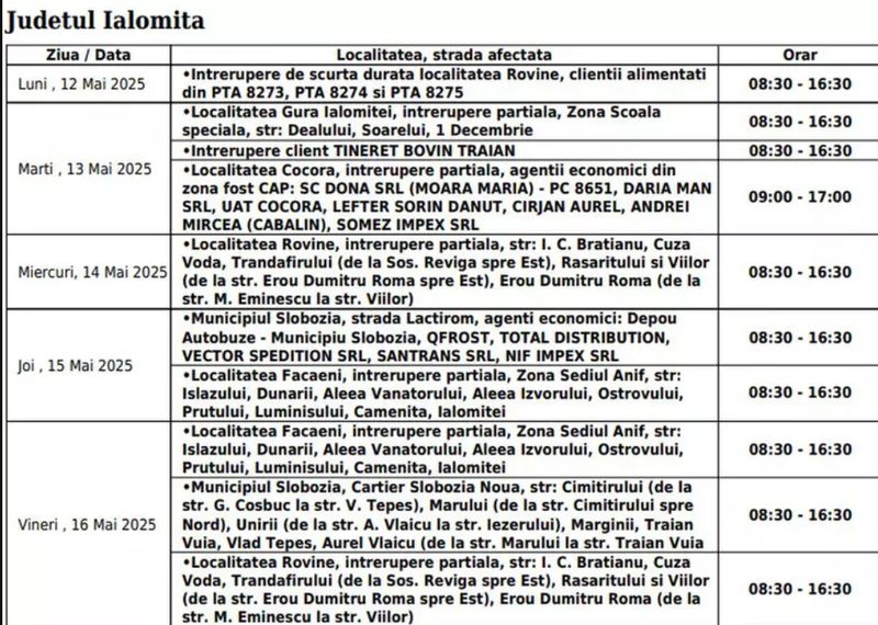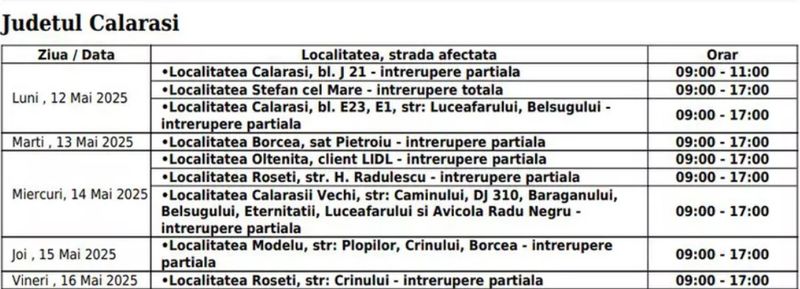 „Aceste lucrări necesită întreruperea programată a alimentării cu electricitate, conform orarului de mai jos. Ne cerem scuze pentru neplăcerile create”,