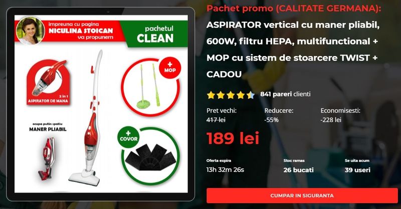 Niculina Stoican vinde mopuri şi aspiratoare, în colaborare cu un site specializat în electrocasnice. Una din primele oferte făcute de celebra cântăreaţă a fost în primăvară, când le-a propus admiratorilor săi un pachet format dintr-un mop, un covor, un aspirator de mână şi unul vertical.