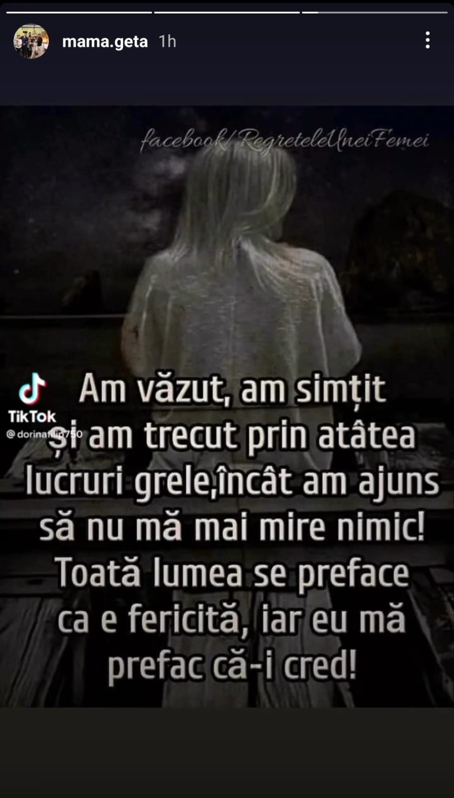 Mama Geta este cunoscută pentru sinceritatea de care dă dovadă, de fiecare dată. Nu puține au fost dățile în care mama lui Culiță Sterp a spus lucrurilor pe nume în public, în fața celor care o urmăresc. De curând, aceasta a distribuit un nou mesaj în mediul online, care i-a surprins pe fani: „Am văzut, am simțit și am trecut prin atâtea lucruri grele, încât am ajuns să nu mă mai mire nimic! Toată lumea se preface că e fericită, iar eu mă prefac că-i cred!”, a fost mesajul postat de mama Geta, pe contul personal de Instagram.