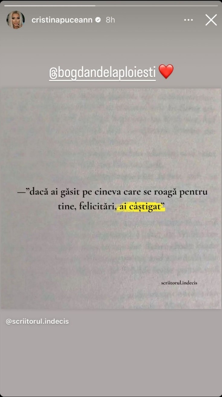 „Dacă ai găsit pe cineva care se roagă pentru tine, felicitări, ai câștigat”, este mesajul pe care i l-a transmis Cristina Pucean iubitului ei, Bogdan de la Ploiești, pe Instagram.