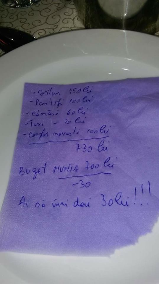 Barbatul a facut o lista cu intreaga cheltuiala pe care a alocat-o nuntii in cauza, de la pretul costumului la coafura sotiei sale, iar la final, a tras o concluzie dureroasa: depasise bugetul pe care si-l alocase pentru acest eveniment cu 30 de lei.