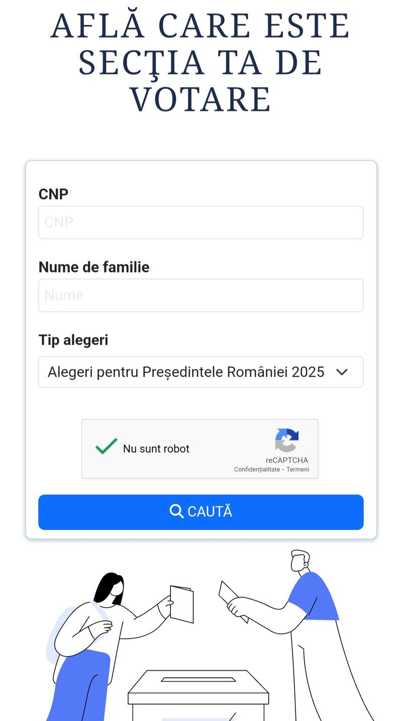 De asemenea, pentru a afla secția de votare la care ești arondat, poți intra pe site-ul Autoritatea Electorală Permanentă, la secțiunea Registrul Electoral. AICI vei introduce CNP, nume de familie și vei selecta tipul de alegeri: Alegeri pentru președintele României 2025 – tur 1, iar mai apoi CAUTĂ.