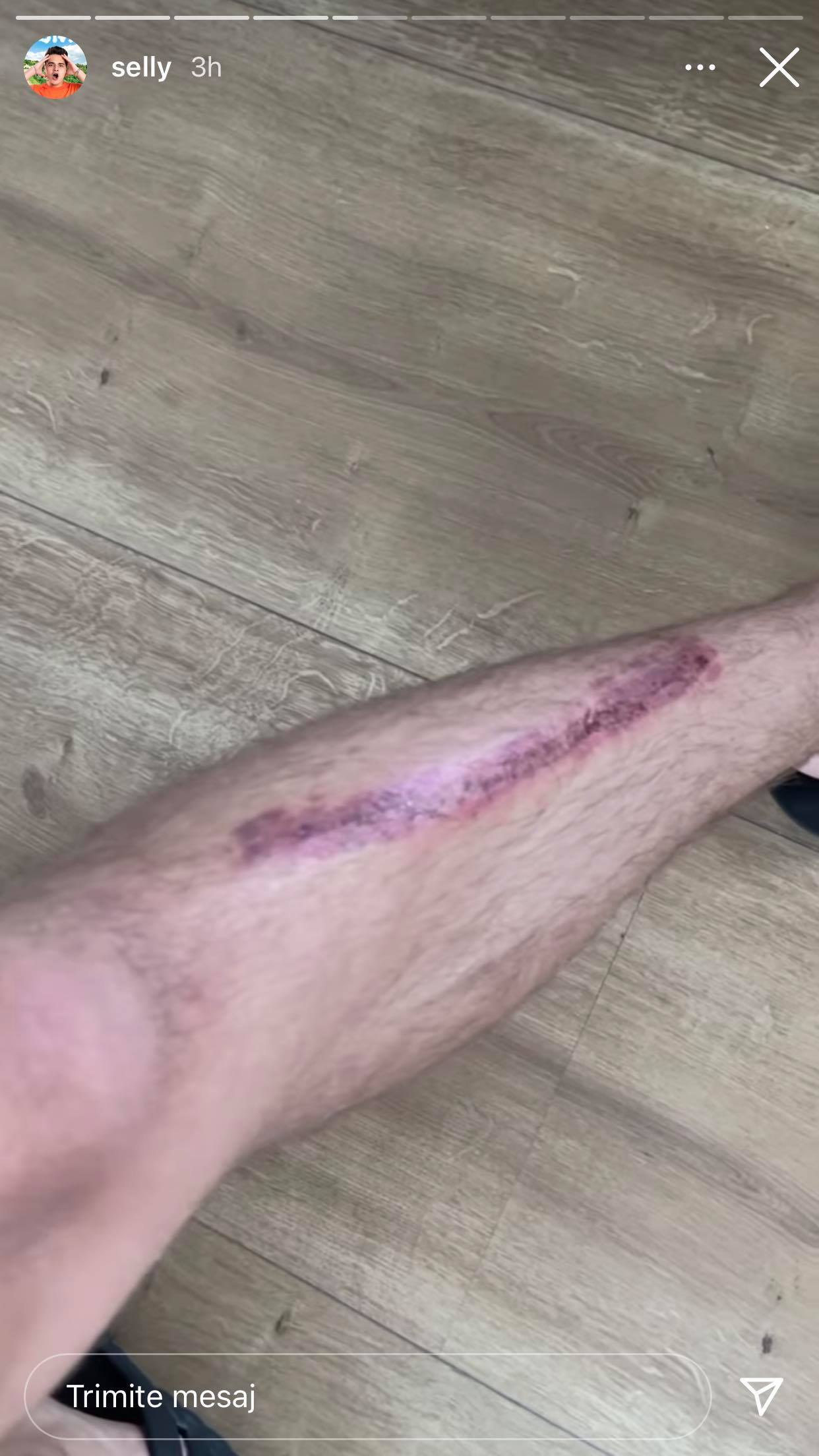 ”Haideti sa va arat ceva din seria: doar eu as putea fi in stare de asa ceva. Uitati cum m-am taiat la picior, în club. Deci, bai, baiatule, zici ca m-am batut cu zece interlopi. Si uitati-va cata taietura am pe picior. Sa va povestesc cum s-a intamplat. M-am impiedicat in cluga, la Tyga. M-am impiedicat de o boxa, bai fratilor, și nu va ganditi..ca stiu ca o sa incepeti cu d alea: Mama, Selly cat de beat erai...
