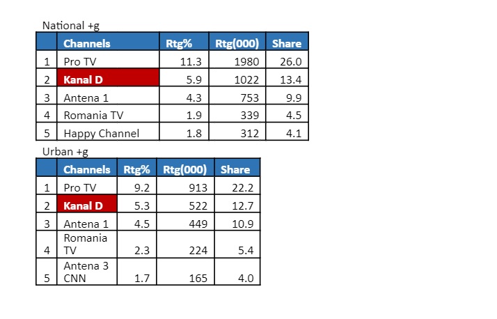 Marți, 20 februarie, Kanal D s-a clasat pe locul doi, pe două categorii de public, pe întreaga durată de difuzare a serialului “O dragoste” (20:00 – 22:30). Astfel, Kanal D a înregistrat 5,9% rating si 13,4% cotă de piață, pe targetul Național, și 5,3% rating și 12,7% cotă de piață, pe targetul All Urban.