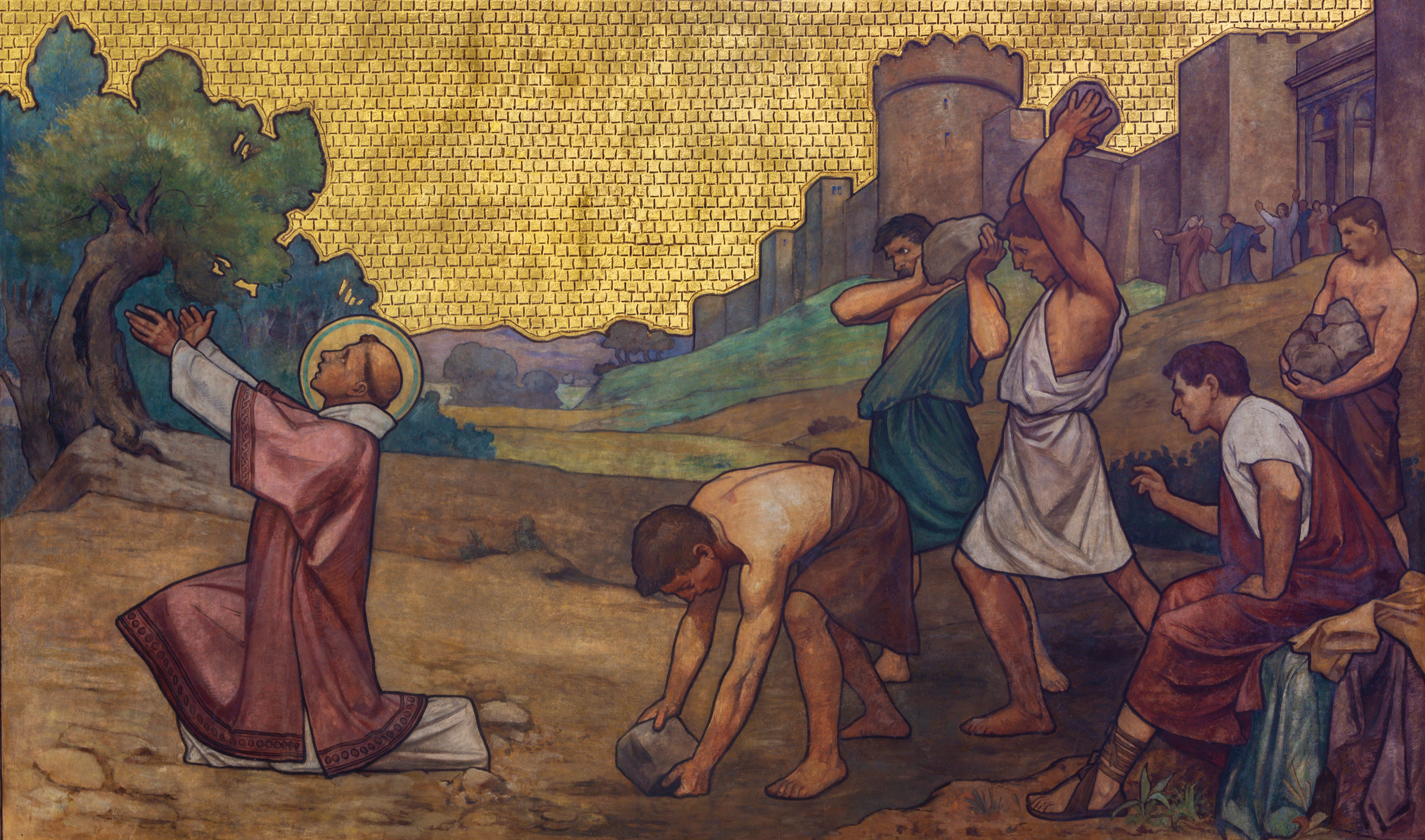 Cu grindina cuvintelor celor ieşite din gura cea de Dumnezeu grăitoare, a surpat întâiul mucenic pe spurcaţii ucigători şi de aceştia, cu nenumărate aruncături de pietre, ca un biruitor s-a încununat.