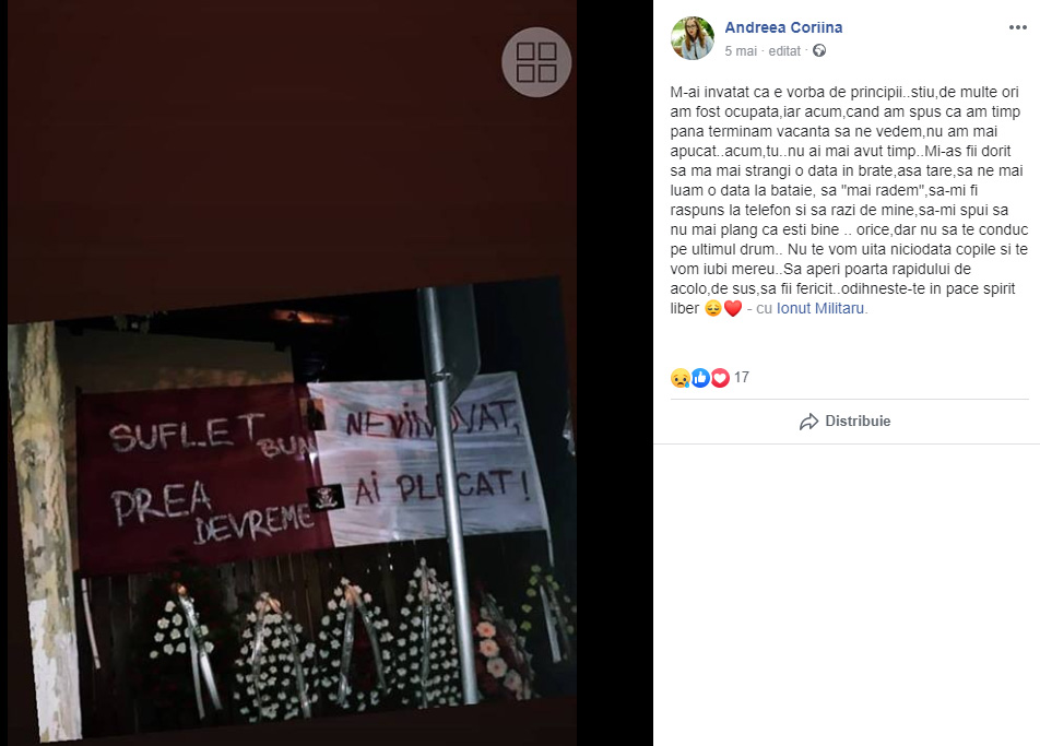 „M-ai invatat ca e vorba de principii..stiu, de multe ori am fost ocupata, iar acum, cand am spus ca am timp pana terminam vacanta sa ne vedem, nu am mai apucat..acum, tu..nu ai mai avut timp. Mi-as fi dorit sa ma mai strangi o data in brate, asa tare, sa ne mai luam o data la bataie, sa „mai radem”, sa-mi fi raspuns la telefon si sa razi de mine, sa-mi spui sa nu mai plang ca esti bine. Orice, dar nu sa te conduc pe ultimul drum.. Nu te vom uita niciodata copile si te vom iubi mereu..Sa aperi poarta Rapidului de acolo, de sus, sa fii fericit..odihneste-te in pace spirit liber!„, scria atunci Andreea Corina Lascu.