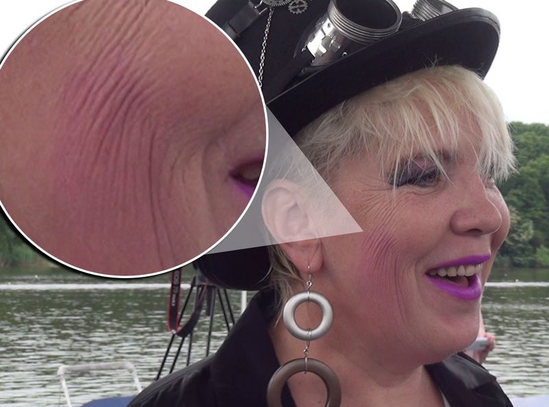 Semnele imbatranirii pornesc din zona ochilor, unde s-au format riduri denumite popular „laba gastii” si continua sa se rasfire ingrijorator pe toata lungimea obrajilor. Pentru o persoana de varsta sa, semnele sunt alarmante si tradeaza faptul ca acest ten nu a fost intretinut niciodata corespunzator.