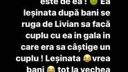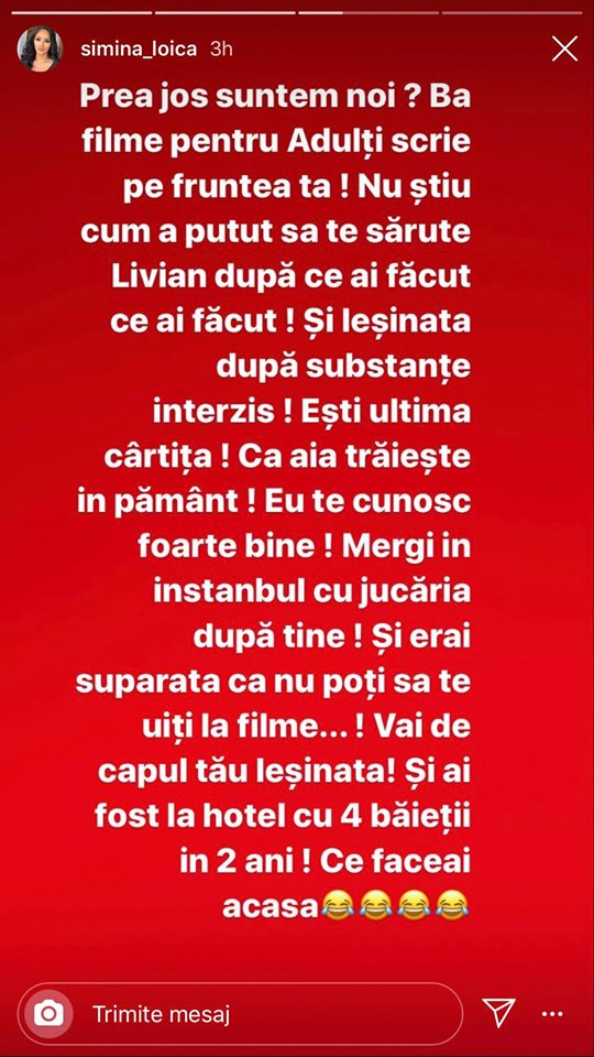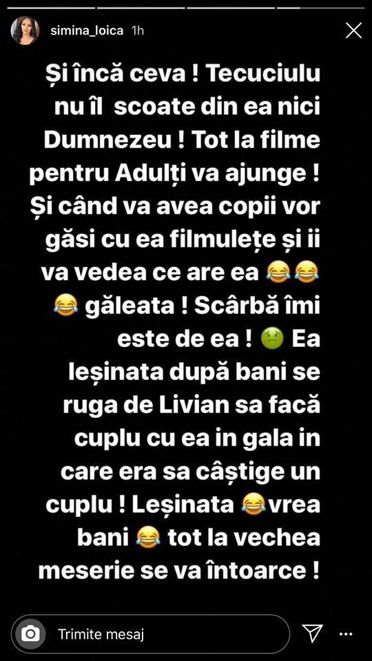 Și încă ceva! Tecuciul nu-l scoate din e nici Dumnezeu. Tot la filme pentru adulți va ajunge. Și când va avea copii, vor găsi filmulețe vor vedea ce are ea. Scârbă îmi este de ea. Ea, leșinată după bani, se ruga de Livian să facă cuplu cu ea în gală! Leținata vrea bani. Tot la vechea meserie se va întoarce!”, a scris Simina Loica la Instastory, după Finala Puterea Dragostei.