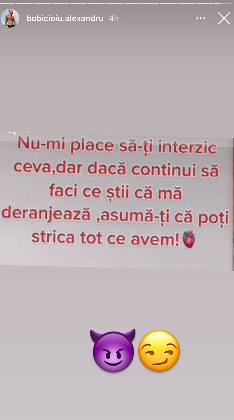 „Nu-ți place să-ți interzic ceva, dar dacă continui să faci ce știi că mă deranjează, asumă-ți că poți strica tot ce avem.”, a scris Alex Bobicioiu în mediul online, cu câteva ore în urmă.