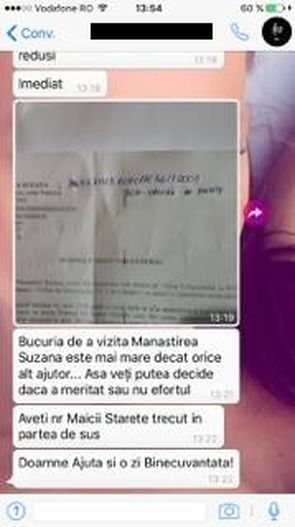„Ma asteptam sa-mi raspunda o maica sau ceva de genul asta, dar in schimb, cel de la capatul firului mi-a tras o injuratura zdravana. Am inchis telefonul si nu-mi venea sa cred cat de aproape am fost sa ma pacalesc. Apoi am inceput sa primesc iar mesaje ca a fost o greseala si ca de fapt a raspuns cineva care nu are legatura cu aceasta cauza. Ulterior am aflat ca asta e un mod de lucru si ca e vorba despre niste impostori care-ti flutura pe la nas o hartie cu stampila manastirii pentru a te insela”, a declarat Simona pentru WOWbiz.ro.