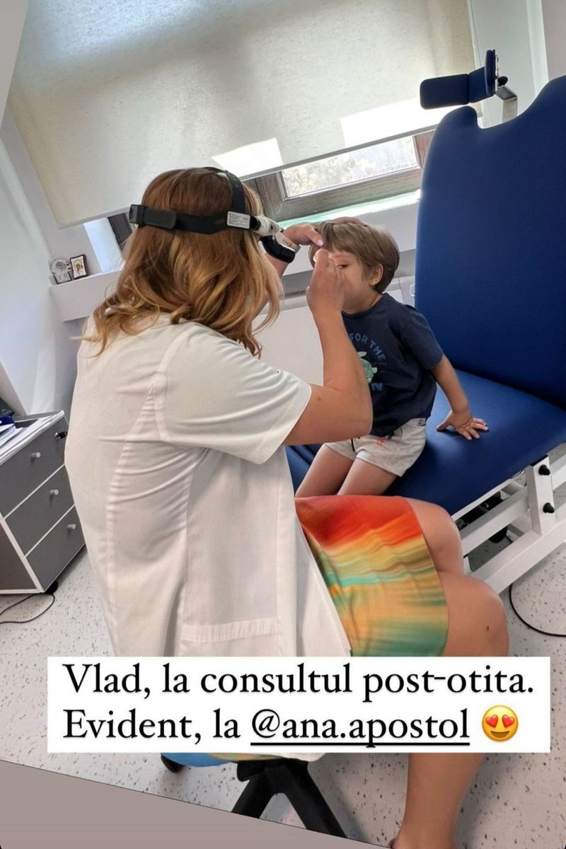 „Vlad, la consult post-otită”, a scris Simona Gherghe, în dreptul imaginii cu fiul ei, de la spital.
