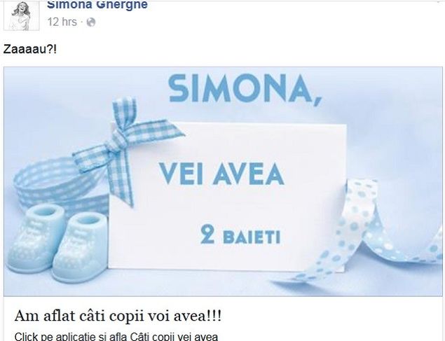 Simona Gherghe si-a facut un test online care iti spune cati copii pe vei. Potrivit acestei aplicatii, prezentatoarea va avea doi baieti. Simona nu este insarcinata, dar isi doreste un copil. Prezentatoarea are o relatie de multi ani cu Razvan Sandulescu, consultant politic.
