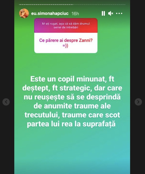 Despre Zanni: „Este un copil minunat, foarte deștept, foarte strategic, dar care nu reuștește să se desprindă de anumite traume ale trecutului, traume care scot partea lui rea la suprafață”.