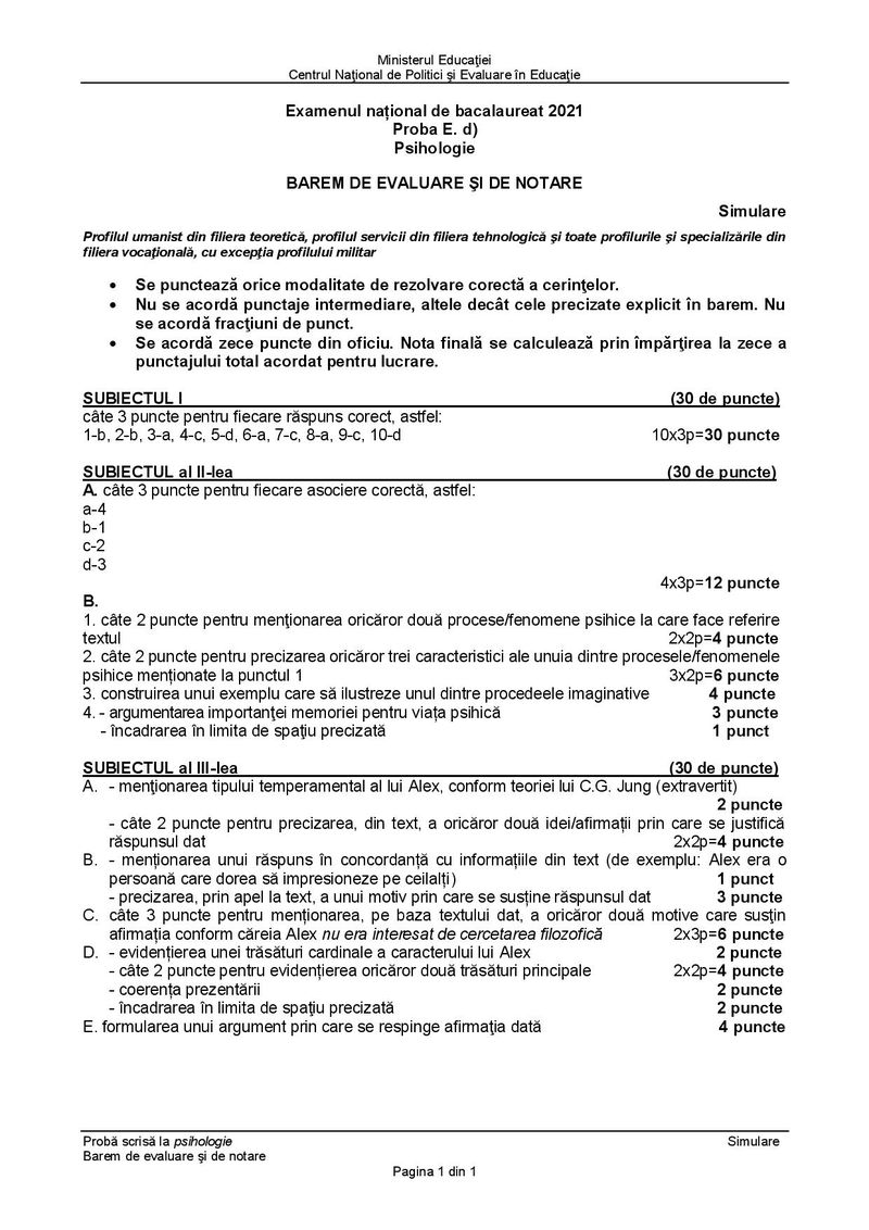 Simulare BAC 2021. Barem de corectare la Psihologie