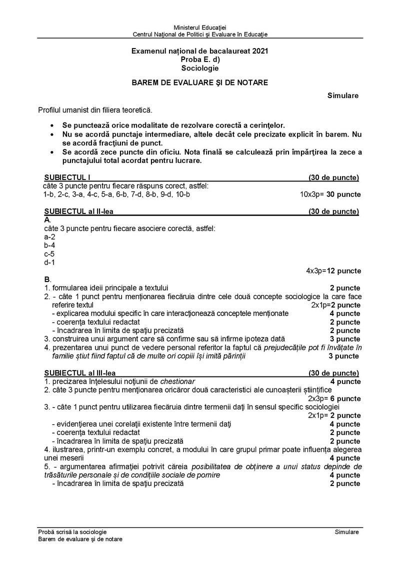 Simulare BAC 2021. Barem de corectare la Sociologie
