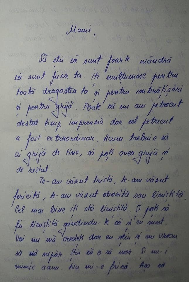 Să ştii că sunt foarte mândră că sunt fiica ta. Îţi mulţumesc pentru toată dragostea ta şi pentru îmbrăţişări şi pentru grijă. Poate că nu am petrecut destul timp împreună, dar cel petrecut a fost extraordinar. Acum trebuie să ai grijă de tine, să poţi avea grijă şi de restul. Te-am văzut tristă, te-am văzut fericită, te-am văzut obosită sau liniştită. Cel mai bine îţi stă liniştită. Şi poţi să fii liniştită gândindu-te că şi eu sunt. Voi nu mă credeţi, dar eu ştiu şi nu vreau să vă supăr. Ştiu că o să mor. Şi nu-i nimic acum.