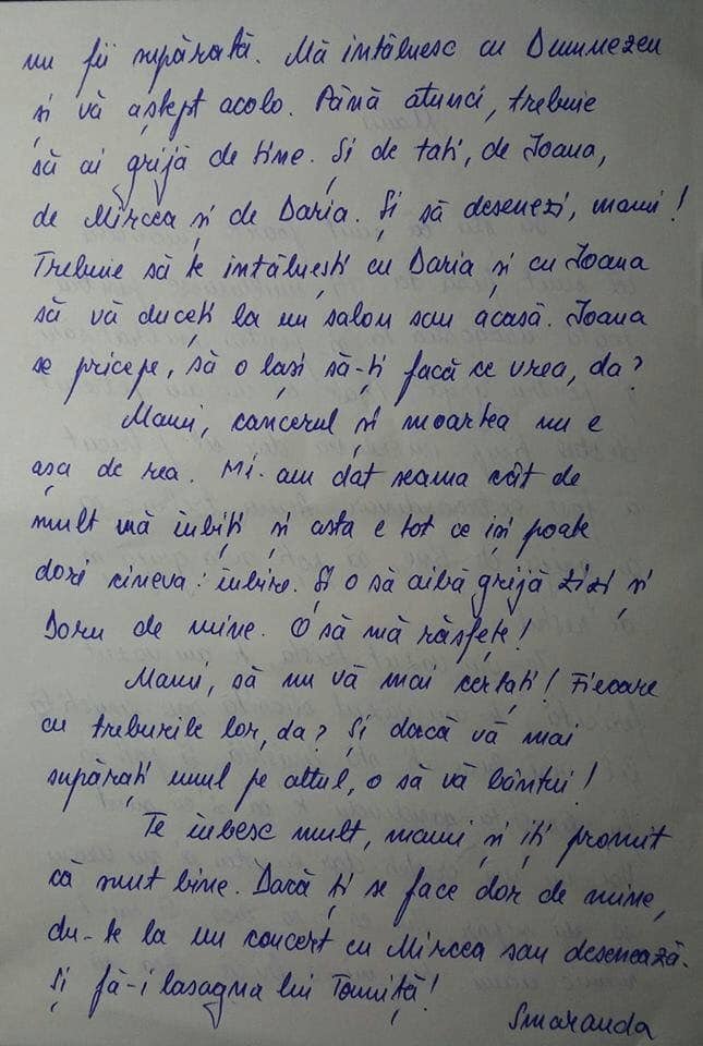Mami, cancerul şi moartea nu sunt aşa de rea. Mi-am dat seama cât de mult mă iubiţi şi asta e tot ce-şi poate dori cineva: iubire. Şi o să aibă grijă Zizi şi Doru de mine. O să mă răsfeţe! Mami, să nu vă mai certaţi! Fiecare cu treburile lor, da? Şi dacă vă mai supăraţi unul pe altul, o să vă bântui! Te iubesc mult, mami şi îţi promit că sunt bine. Dacă ţi se face dor de mine, du-te la un concert cu Mircea sau desenează şi fă-i lasagna lui Tomiţă!
