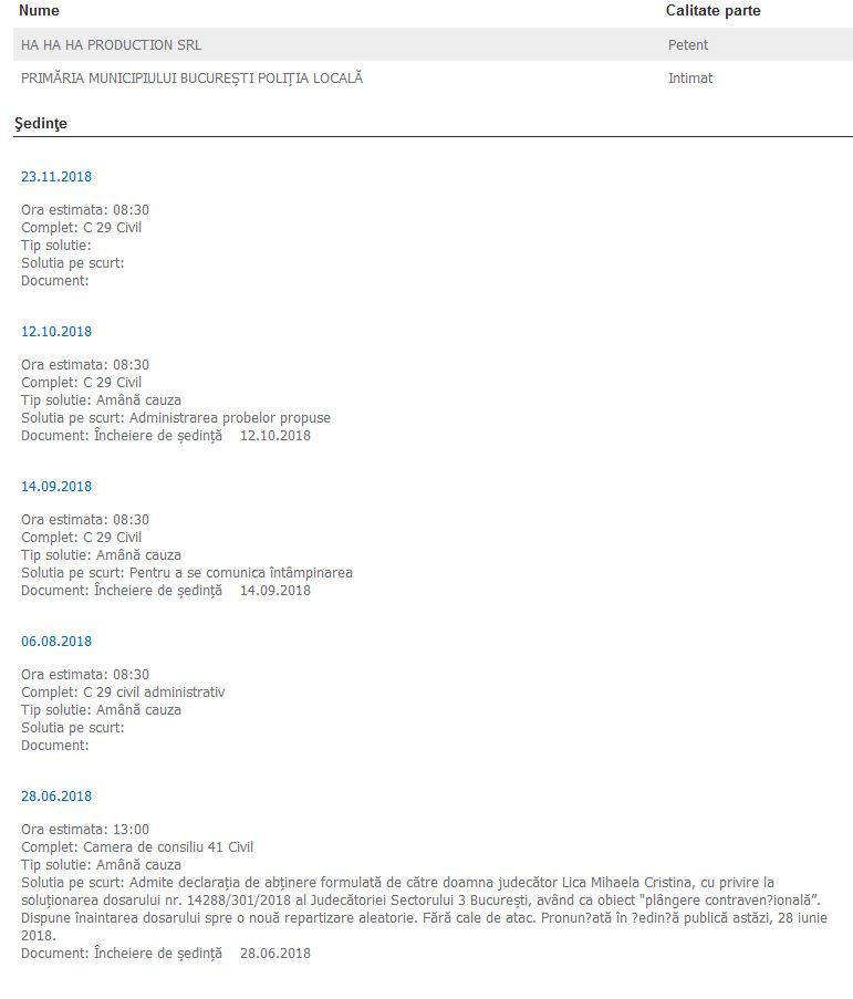Procesul prin care Smiley contestă o banală amendă primită de la Poliţia Locală Bucureşti a început cu un moment de derută, după ce judecătoarea repartizată să soluţioneze cauza a cerut să fie schimbată. Mihalea Cristina Lică, magistratul care ar fi trebuit să judece dosarul ”HaHaHa Production vs Poliţia Locală” a făcut o cerere de abţinere pe motiv că are… legături personale cu patronul companiei.