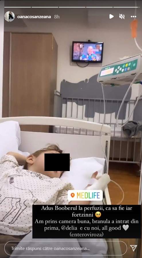 „Adus Booberul la perfuzii, ca să fie iar fortzinni. Am prins cameră bună, branula a intrat din prima, Delia e cu noi, totul bine (enteroviroză)”, a scris Oana Matache într-un story pe contul ei de Instagram, în care apare și băiețelul ei.