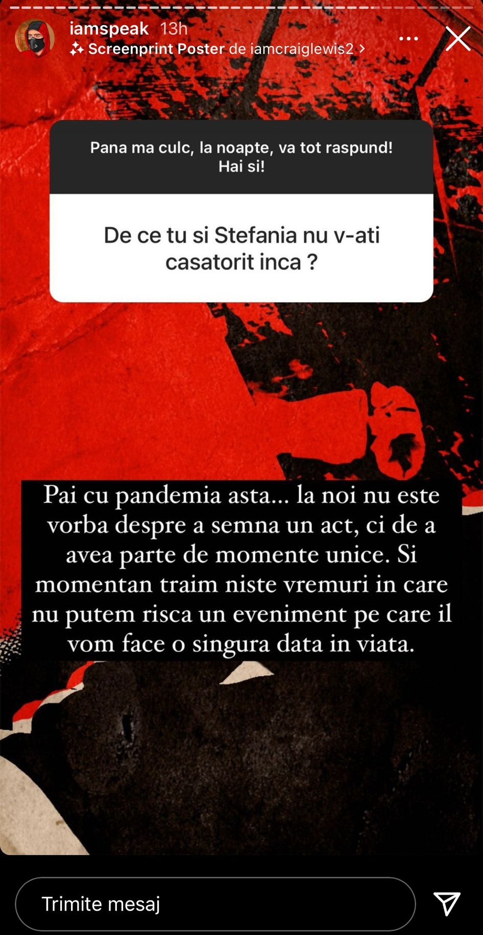 „Păi cu pandemia asta... la noi nu este vorba despre a semna un act, ci de a avea parte de momente unice. Și momentan trăim niște vremuri în care nu putem risca un eveniment pe care ăl vom face o singură dată în viață”, a fost răspunsul dat de Speak.