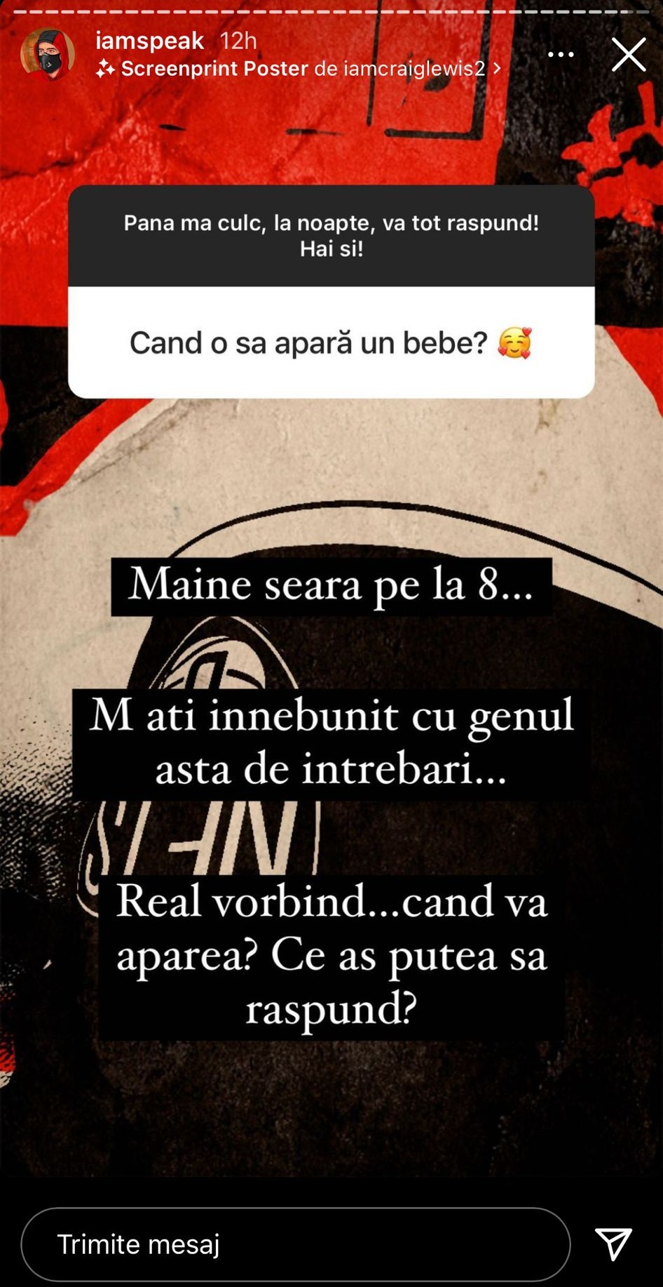 „Mâine seară pe la 8... M-ați înnebunit cu genul ăsta de întrebări. Real vorbind... când va apărea? Ce aș putea să răspund”, a mărturisit Speak, la Instastory.