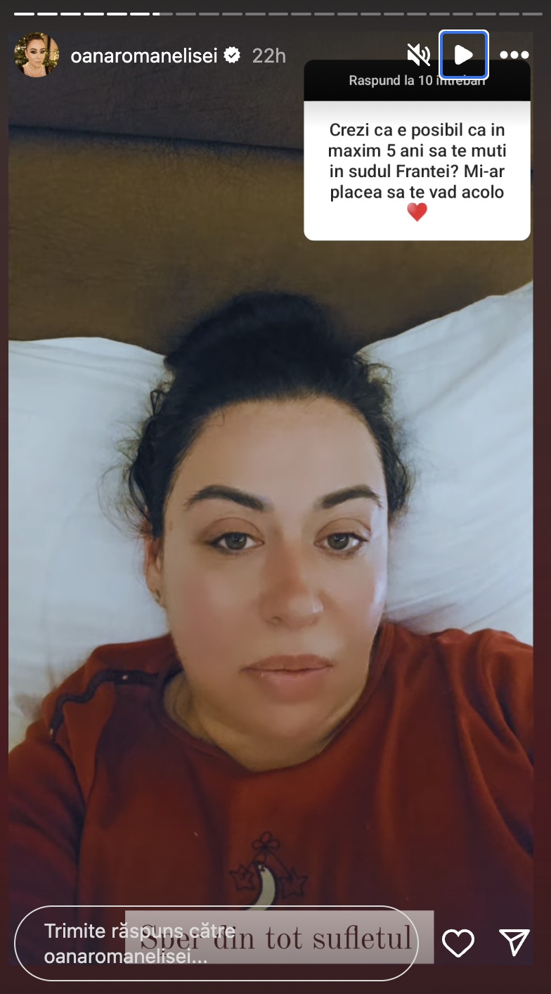 Oana Roman a fost întrebată de un internaut dacă în 5 ani este posibil să își îndeplinească marele vis de a se muta în Franța definitiv. Vedeta a oferit un răspuns afirmativ, lăsând să se înțeleagă că părăsirea României este una dintre marile sale dorințe, încă neîndeplinite.
