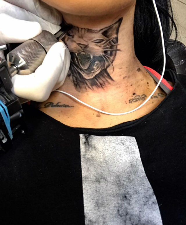 Mihaela Zagrean, cunoscuta drept „Sprintecatoarea de la morga” dupa ce s-a pozat printre cadavre, si-a facut un tatuaj care i-a lasat masca pe internauti. Bruneta si-a „desenat” pe gat o pisica. (vezi si: Cum arata abdomenul Mihaelei dupa trei operatii de cezariana)