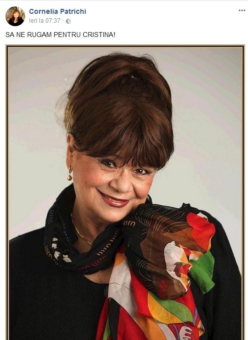Desi durerea pierderii unei astfel de personalitati este una imensa, Cornelia Patrichi i-a incurajat, totusi, pe oameni sa nu uite sa se roage si pentru Cristina Stamate. Actrita a fost internata in spital, in stare grava, exact in ziua in care Stela Popescu a fost gasita moarta.