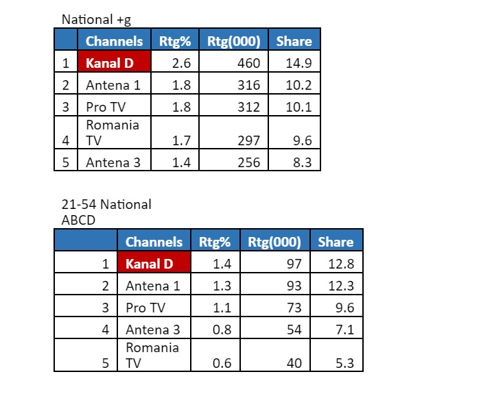 Ieri, in intervalul orar 12:00 – 13:00, Kanal D a fost lider de piață, pe două categorii de public, înregistrând 2,6% rating si 14,9% cotă de piață, pe targetul Național, si 1,4% rating si 12,8% cotă de piață, pe targetul Comercial (21-54 ABCD).