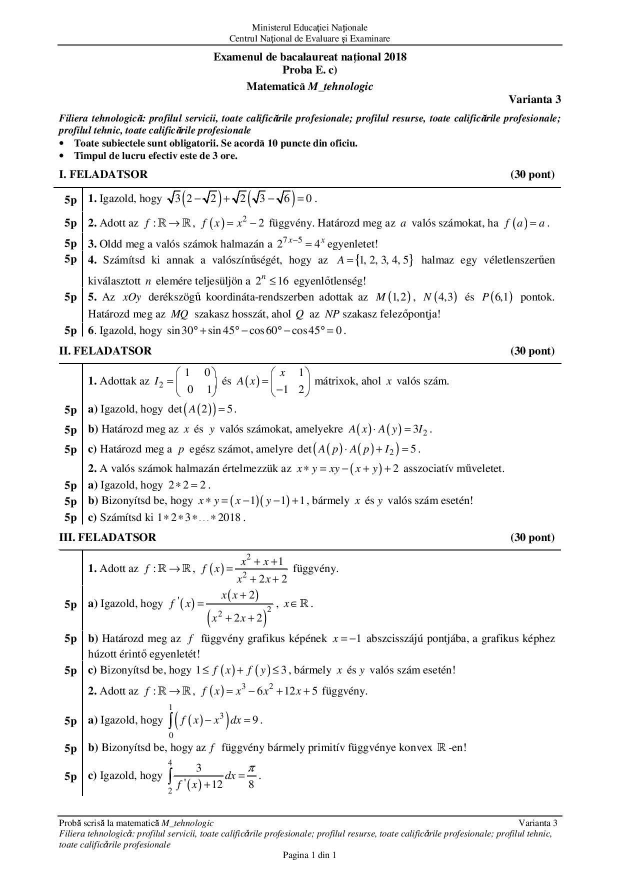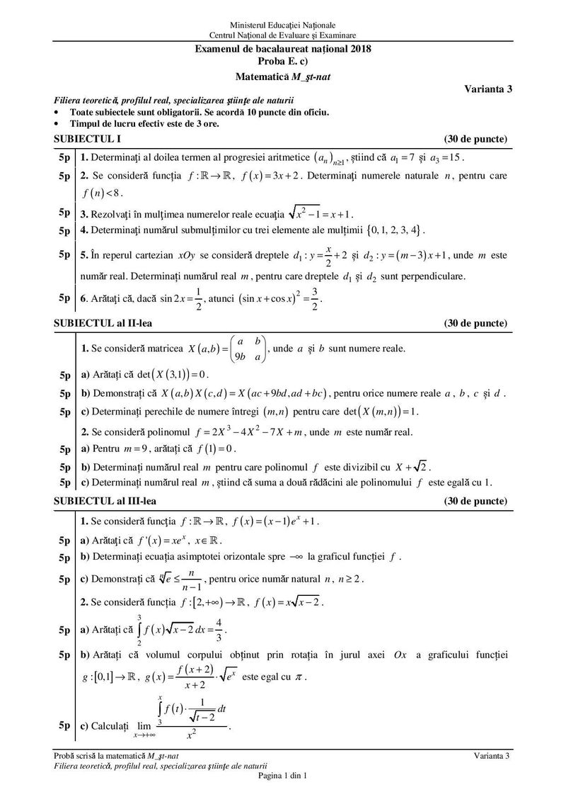 Subiecte Matematică BAC 2018 Ştiinţe ale Naturii: