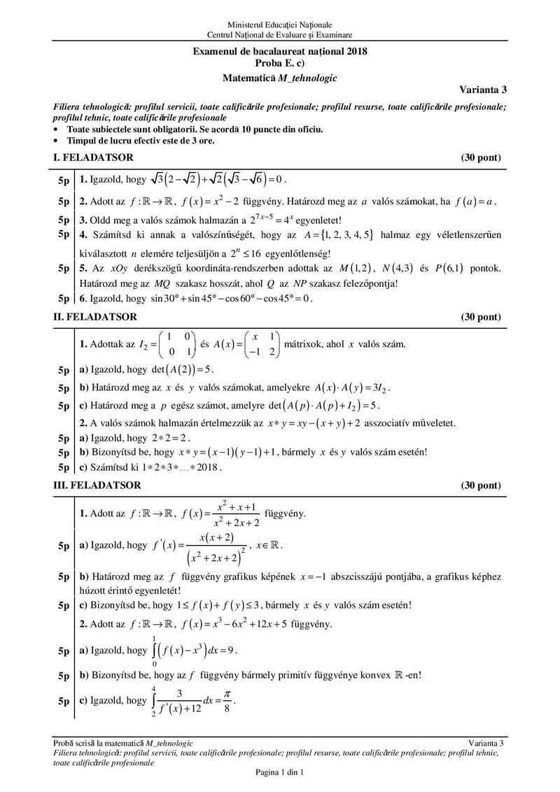Subiecte Matematică BAC 2018 Tehnologic: