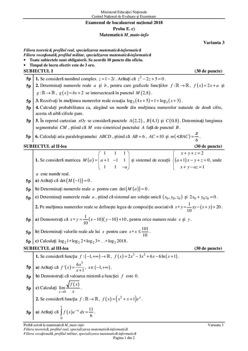 Subiecte Matematică BAC 2018 Matematică – Informatică:
