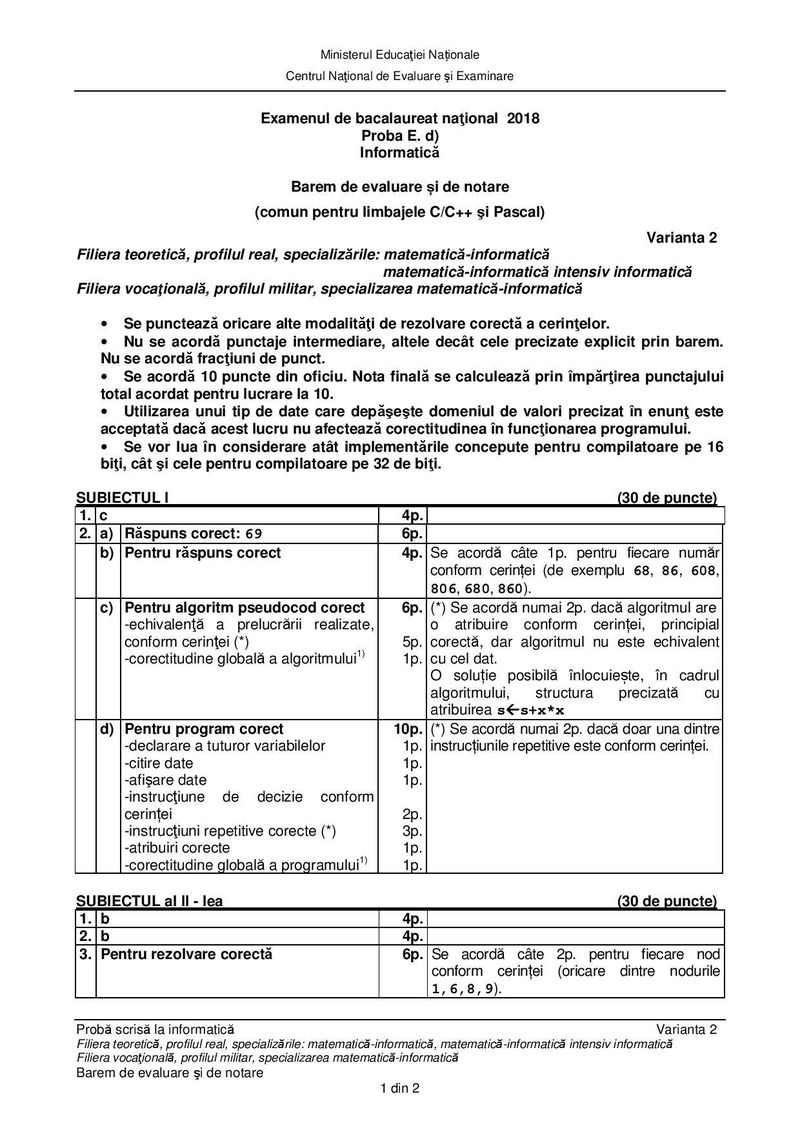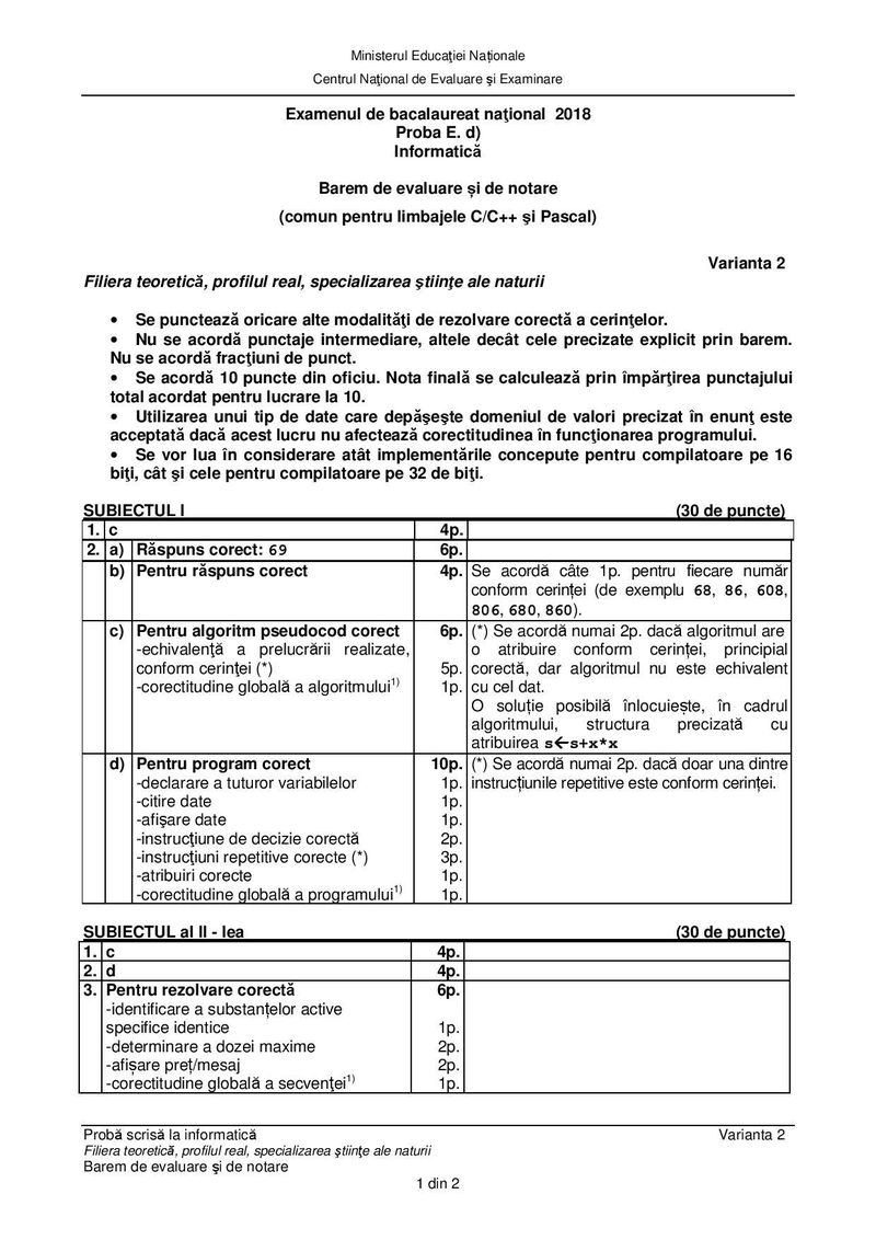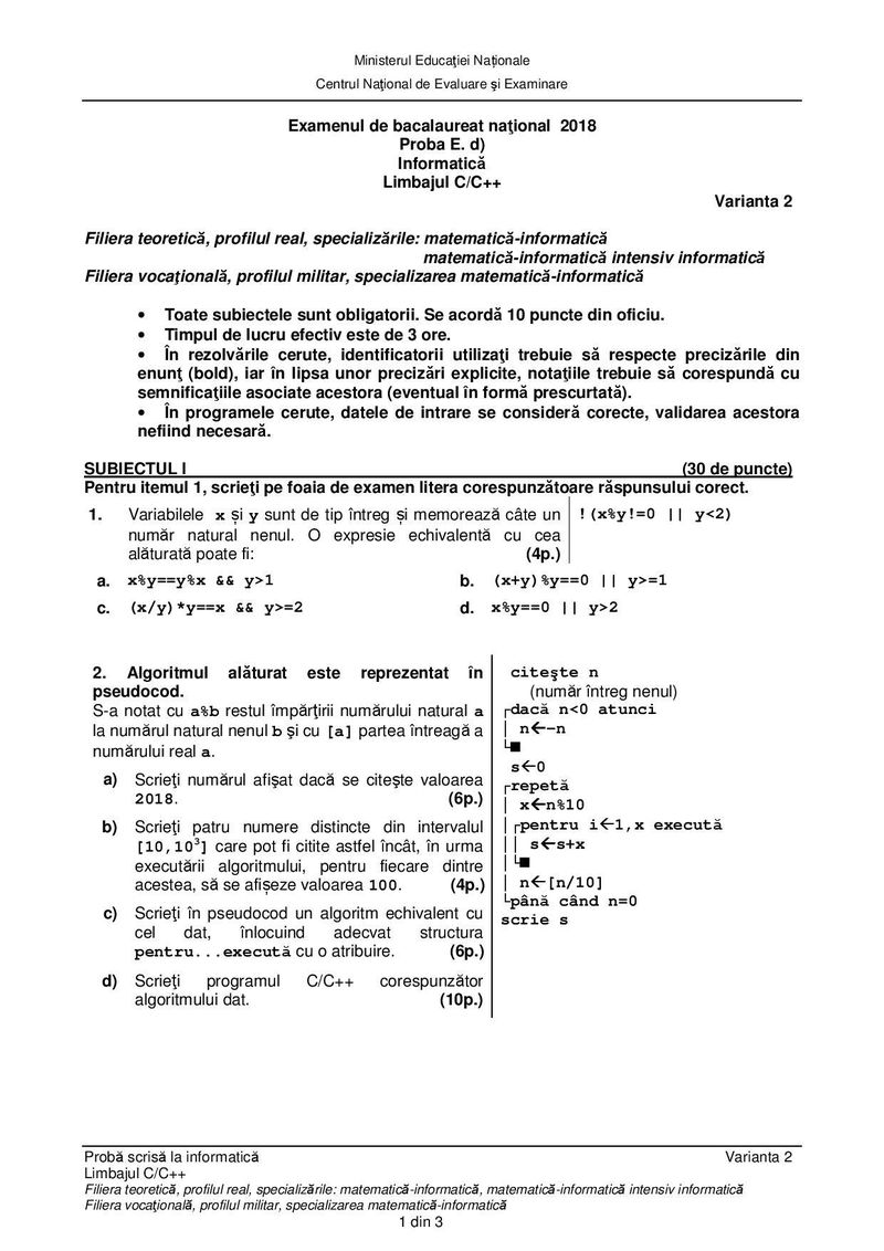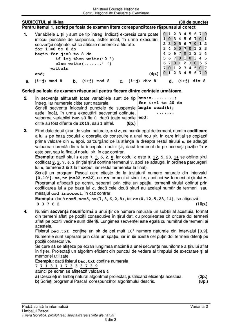 Subiecte şi barem Informatică BAC 2018. Potrivit calendarului Ministerului Educaţiei Naţionale, luni a fost susţinută proba la Limba şi literatura română. Marţi, în a doua zi de probe scrie din cadrul Bacalaureatului, s-a dat examane la limba maternă (maghiară, germană, sârbă, slovacă, croată, turcă, ucraineană şi italiană). Miercuri, 27 iunie, s-au susţinut probele la alegere. O partea a elevilor a dat examen la Istorie, alta la Matematică.
