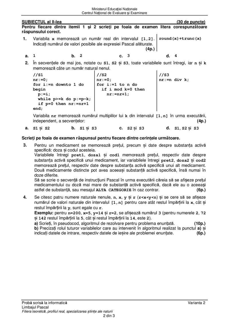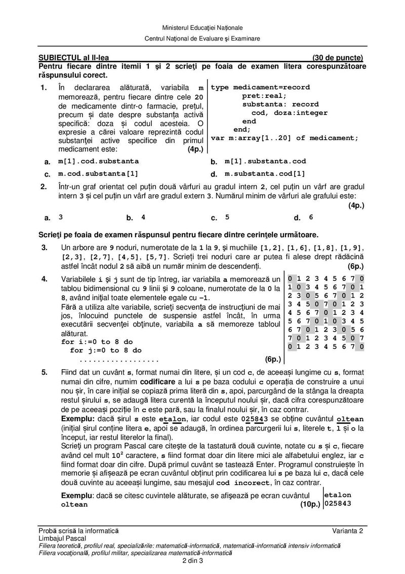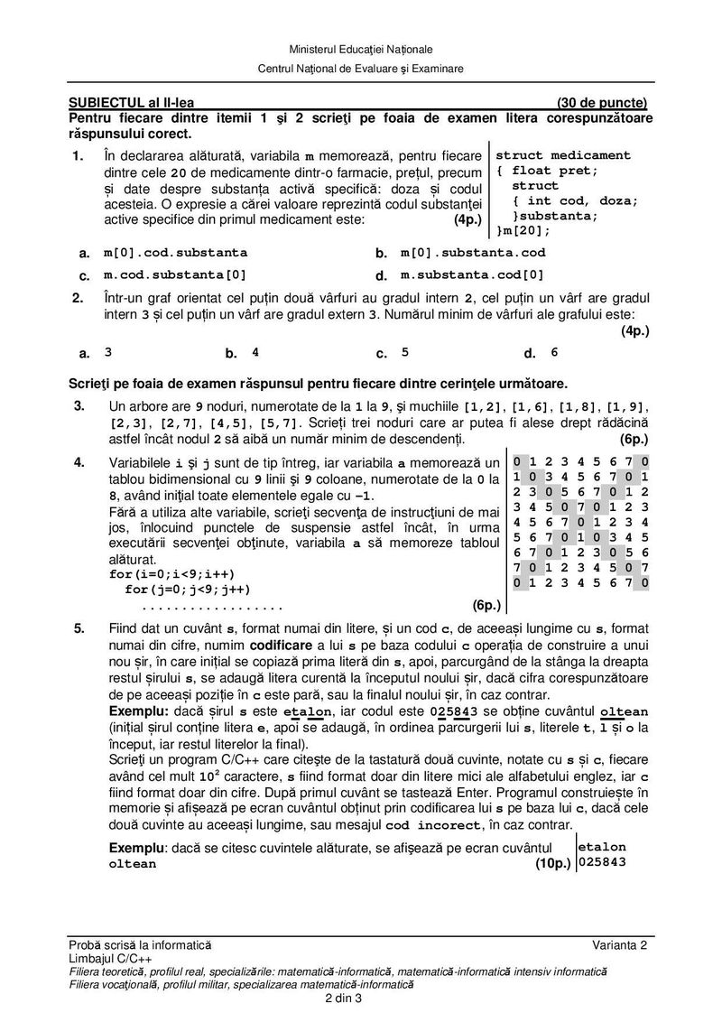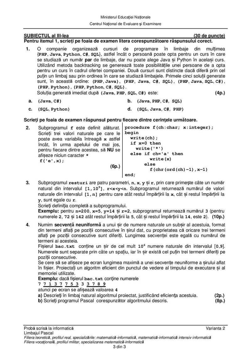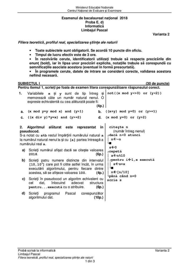 Subiecte şi barem Informatică BAC 2018. Potrivit calendarului Ministerului Educaţiei Naţionale, luni a fost susţinută proba la Limba şi literatura română. Marţi, în a doua zi de probe scrie din cadrul Bacalaureatului, s-a dat examane la limba maternă (maghiară, germană, sârbă, slovacă, croată, turcă, ucraineană şi italiană). Miercuri, 27 iunie, s-au susţinut probele la alegere. O partea a elevilor a dat examen la Istorie, alta la Matematică.