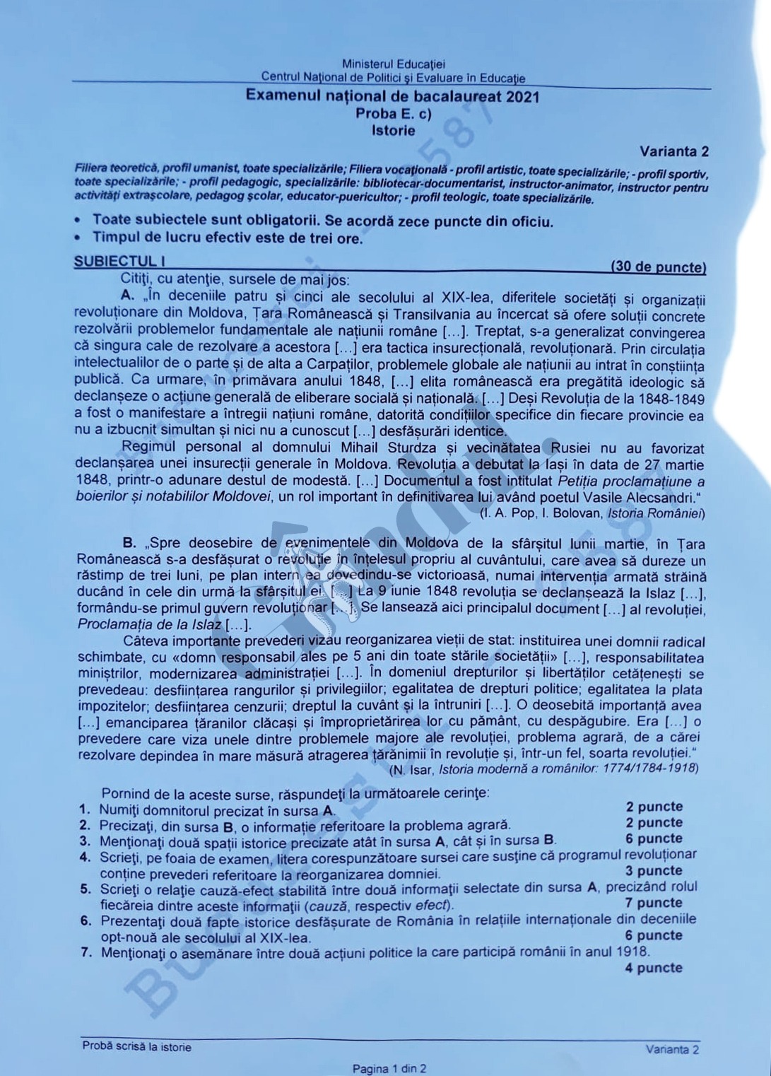 Ce subiecte au avu de rezolvat elevii claselor terminale de liceu la istorie, proba obligatore a profilului din cadrul examenului de Bacalaureat 2021?
