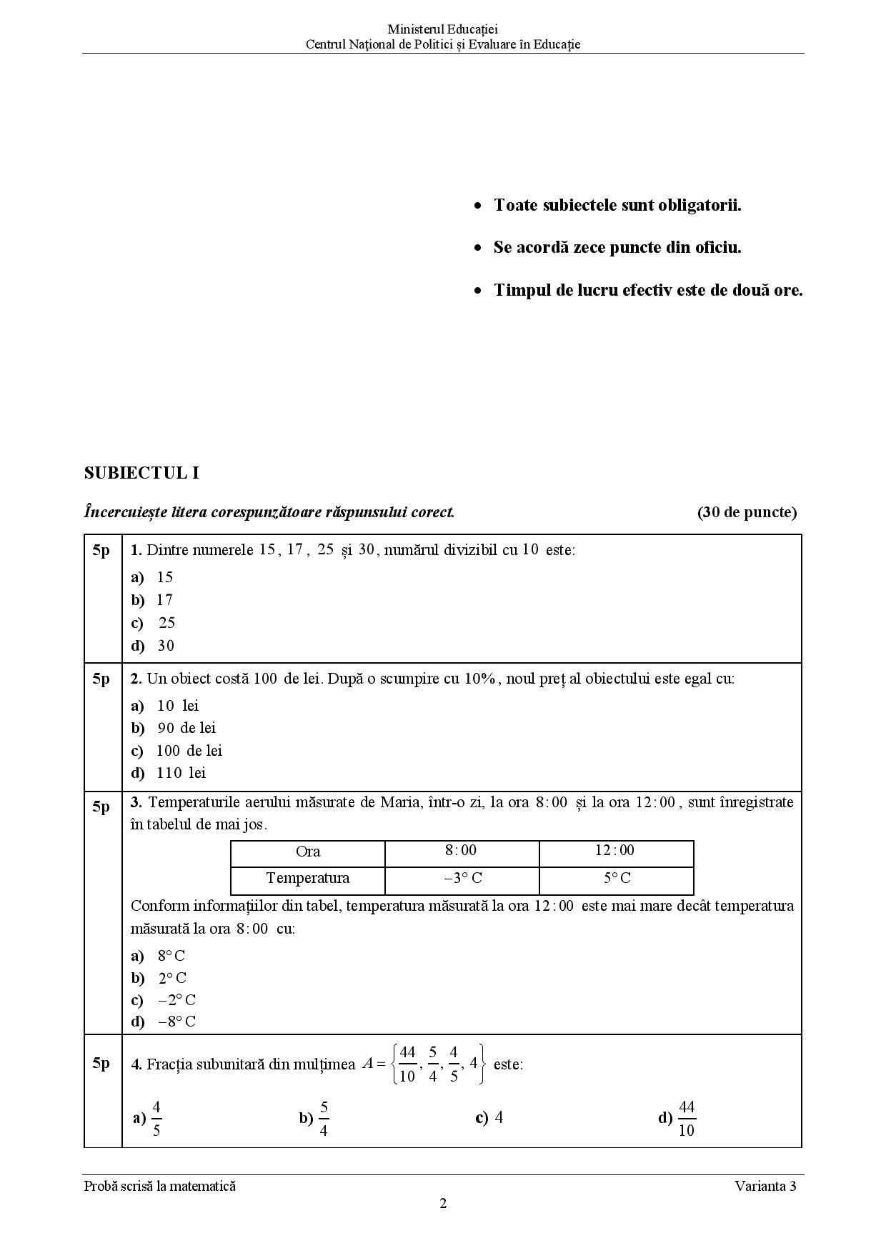 Accesul elevilor în sălile de examen va fi permis până la ora 8.30. Examenul propriu-zis începe la ora 9.00, după primirea subiectelor, şi durează 120 de minute (două ore).