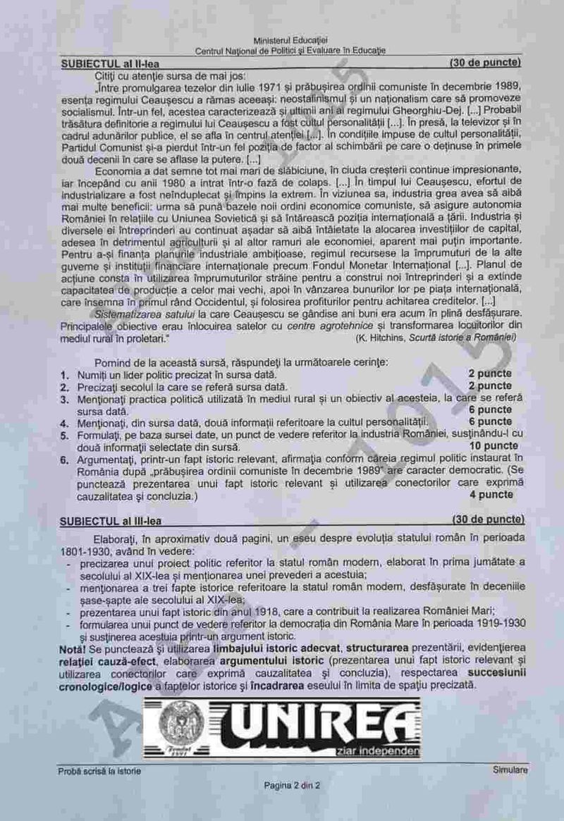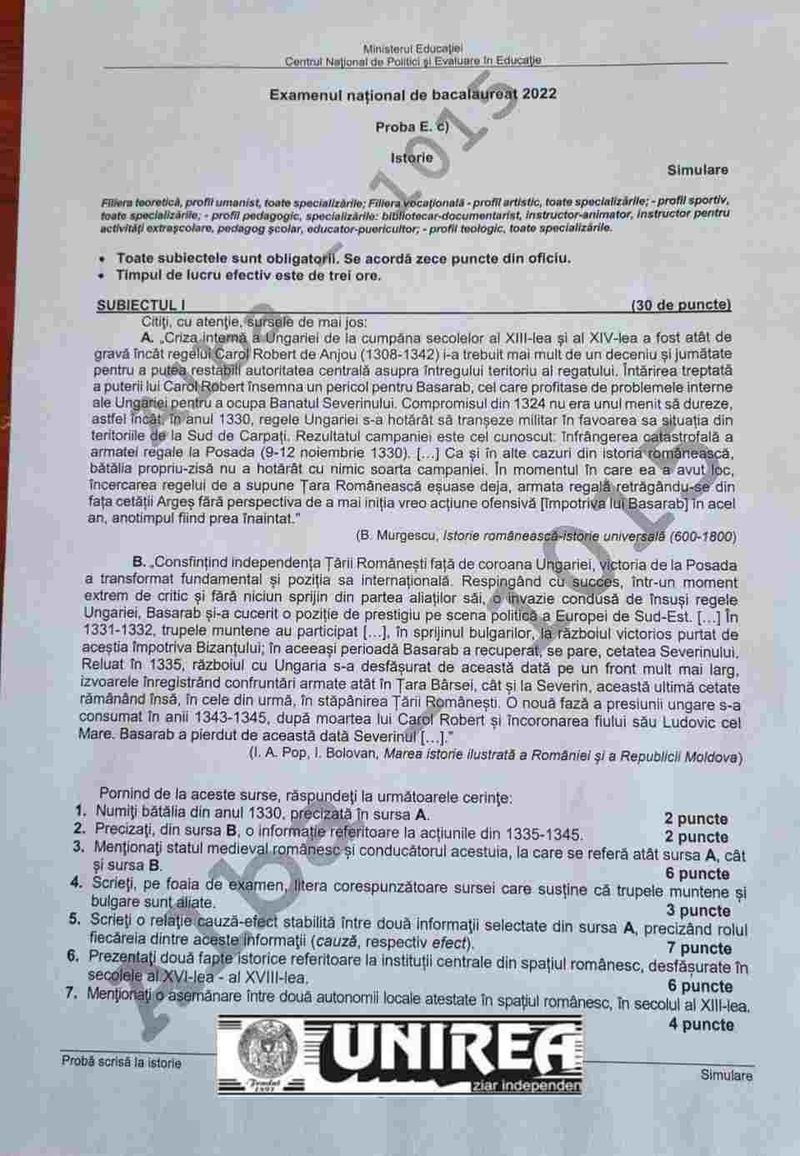 Subiecte simulare Istorie BAC 2022. Ce subiecte au picat la Istorie la simulare Bacalaureat 2022. Barem de corectare EDU.RO