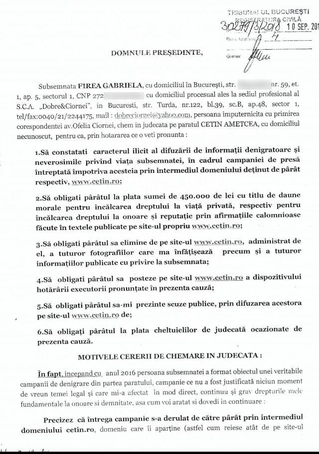 „Incepand cu anul 2016 persoana subsemnatei a format obiectul unei veritabile campanii de denigrare din partea paratului, campanie ce nu a fost justificata nici un moment de vreun temei legal si care mi-a afectat in mod direct, continuu si grav drepturile mele fundamentale la onoare si demnitate”, scrie Gabriela Firea in chemarea in judecata impotriva bloggerului Cetin Ametcea.