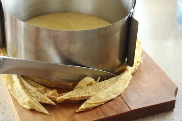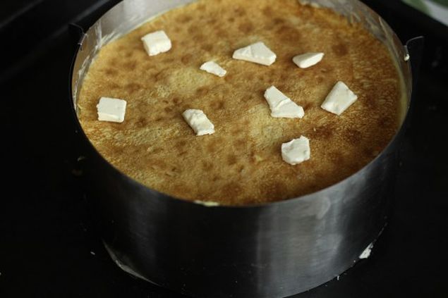 4. Forma in care se asambleaza tortul se aseaza pe tava cuptorului si se unge cu unt solid. La fund se pune un disc de hartie de copt de marime potrivita si se aseaza prima clatita, care se unge cu 2-3 linguri generoase de crema de urda.