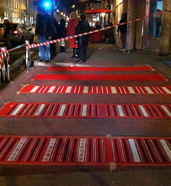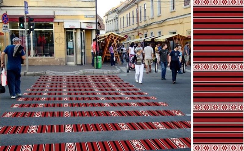 Ceea ce se vede in aceste fotografii sunt noile treceri de pietoni de care se bucura locuitorii din Cluj. O tanara artista in varsta de 29 de ani a avut ideea asta si a si reusit sa convinga autoritatile sa marcheze o trecere de pietoni cu modive traditional romanesti.