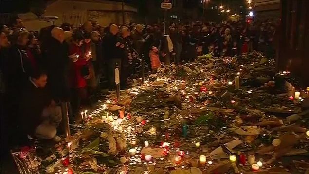 Sute de persoane se aflau in Piata Republicii din Paris pentru a aduce un omagiu victimelor atentatelor teroriste din Paris de la finalul saptamanii.
