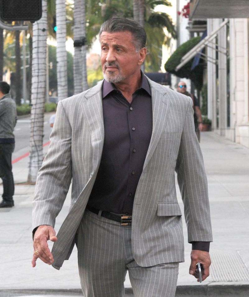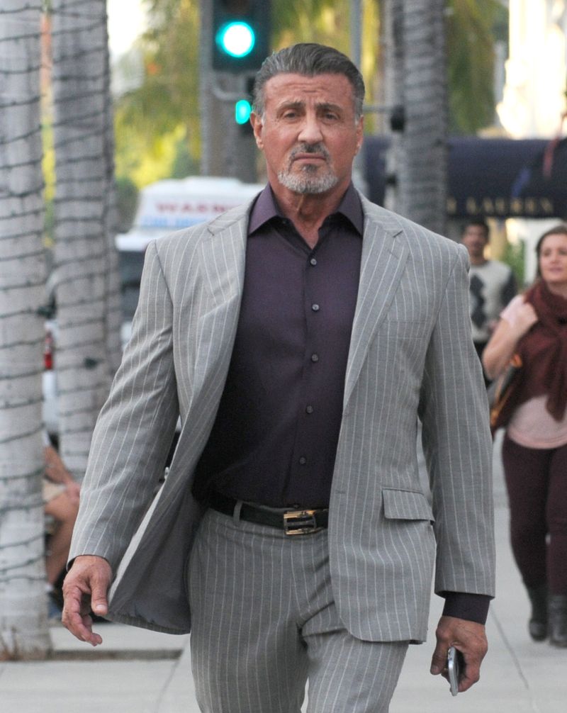Cu barba si parul incaruntite, cu riduri, Stallone e departe de sexy-simbolul care facea furori in „Rambo”. Cu toate acestea, actorul a impresionat intotdeauna prin eleganta. Chiar zi zilele trecute, Stallone a fost surprins de paparazzi intr-un costum gri, cu o camasa inchisa la culoare, la fel de elegant si prezentabil ca intotdeauna.