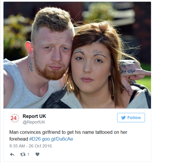 Kourtney Leigh, o tanara de 20 de ani din Anglia, a vrut sa-i dovedeasca iubitului sau ca-l iubeste cu adevarat si a acceptat sa-si tatueze numele lui pe frunte. Asadar, femeia si-a scris „Ryan” deasupra spancenei stangi si porecla lui „Wibbo” deasupra celei din partea dreapta.