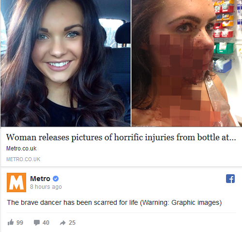 Chloe Knapton a simtit pe propria piele ce inseamna teroarea. Tanara de doar 21 de ani a fost atacata in masina personala. Se afla in autovehicul cand cineva a aruncat o sticla in masina sa care a spart geamul si a lovit-o provocandu-i rani urate. Femeia s-a ales cu multe copci care ii vor lasa cicatrici atat pe fata, cat si pe corp.
