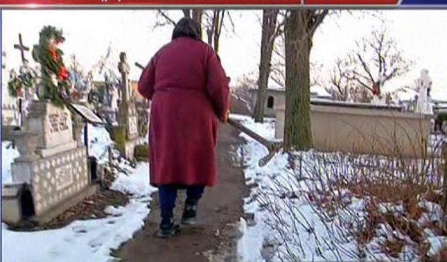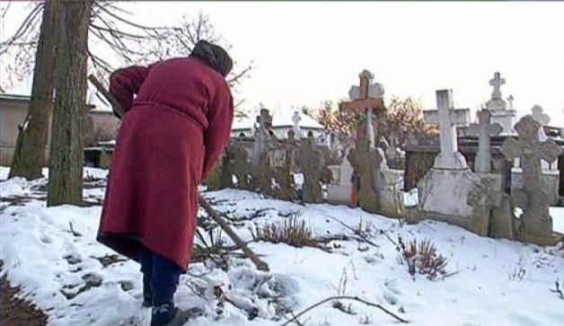 Aproape zi de zi, merge printre morminte si face curatenie."Ma duc la cimitir, ma duc la tamaiat, car apa. Asa fac in fiecare zi. Ce vrea omul sa imi dea, aia primesc. Imi dau si bani sau mancare. Fac asta de cand a murit barbatul meu.".